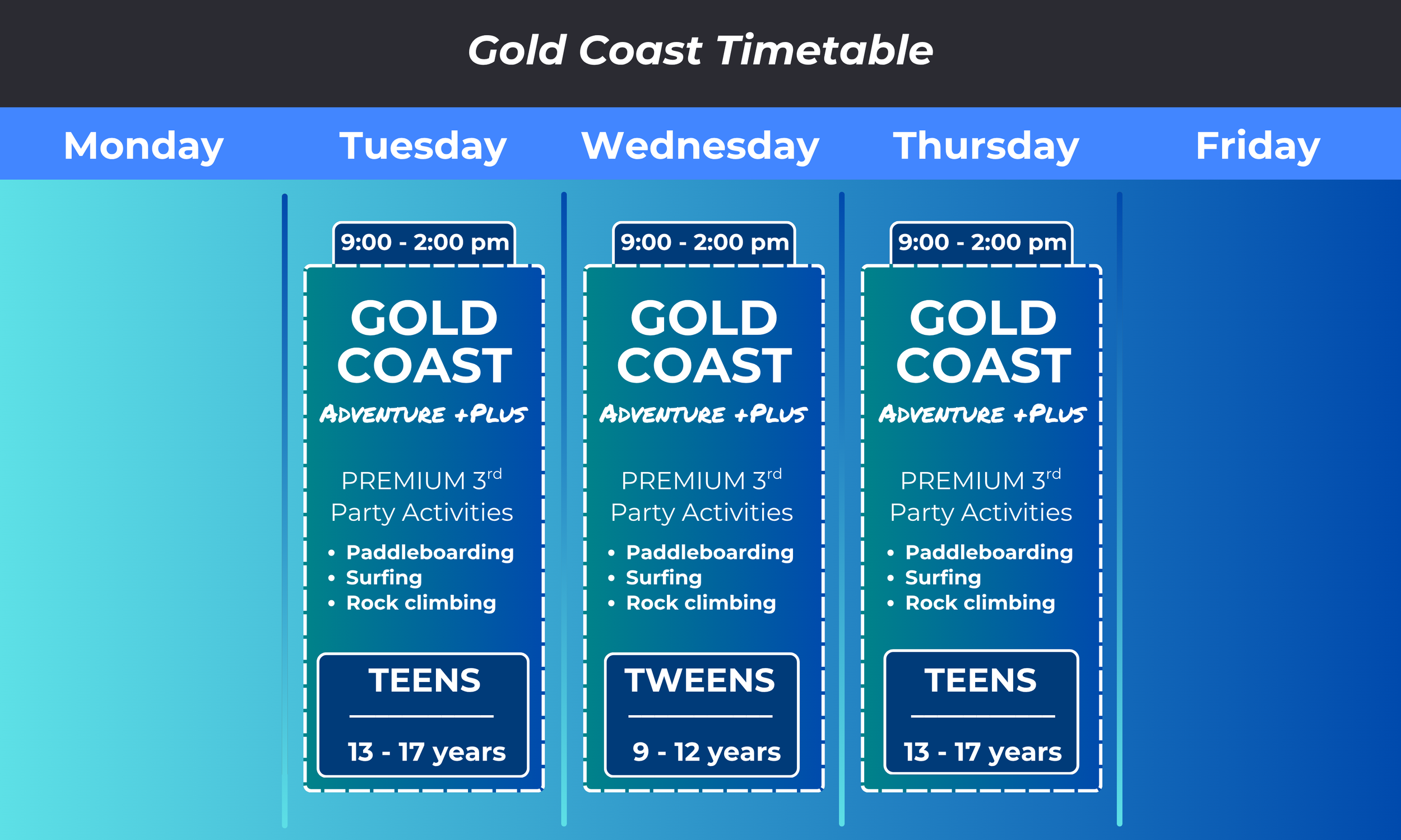 Adventure +Plus includes everything in Core plus a handful of premium activities each term - think wakeboarding, escape rooms, paddleboarding, or indoor skydiving. These high-value sessions add an exciting twist to the term and make it truly memorable.
