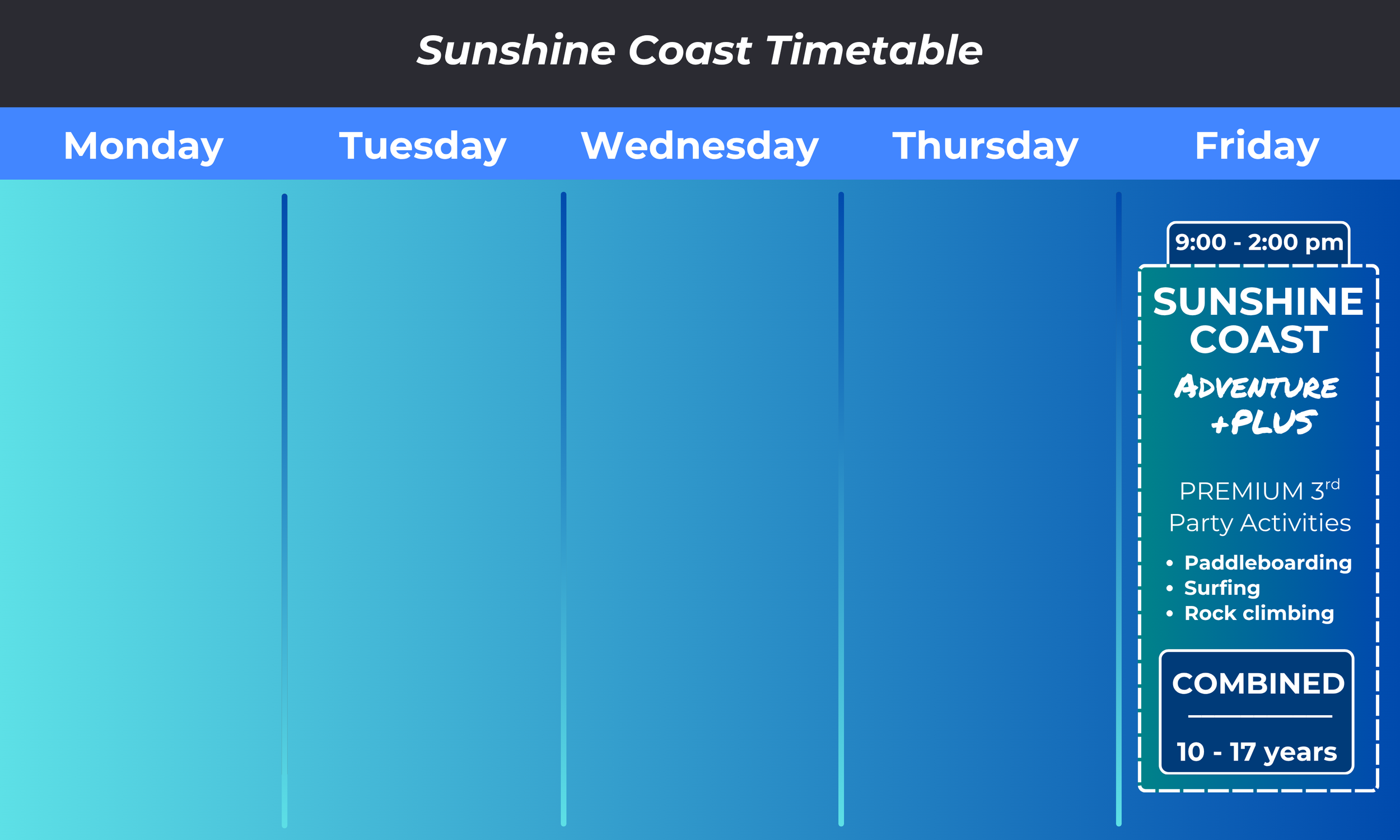 Adventure +Plus includes everything in Core plus a handful of premium activities each term — think wakeboarding, escape rooms, paddleboarding, or indoor skydiving. These high-value sessions add an exciting twist to the term and make it truly memorable.