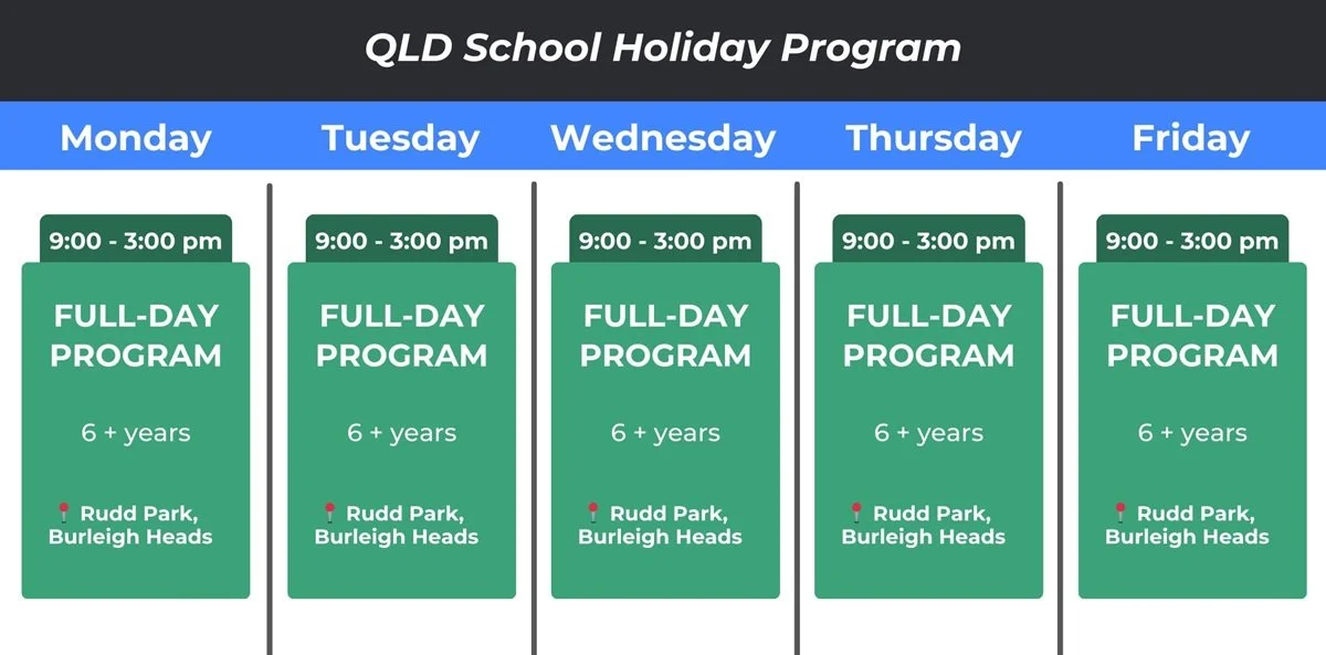 Sessions run between Monday and Friday of the QLD school holidays. Check our exact dates available through the booking links.